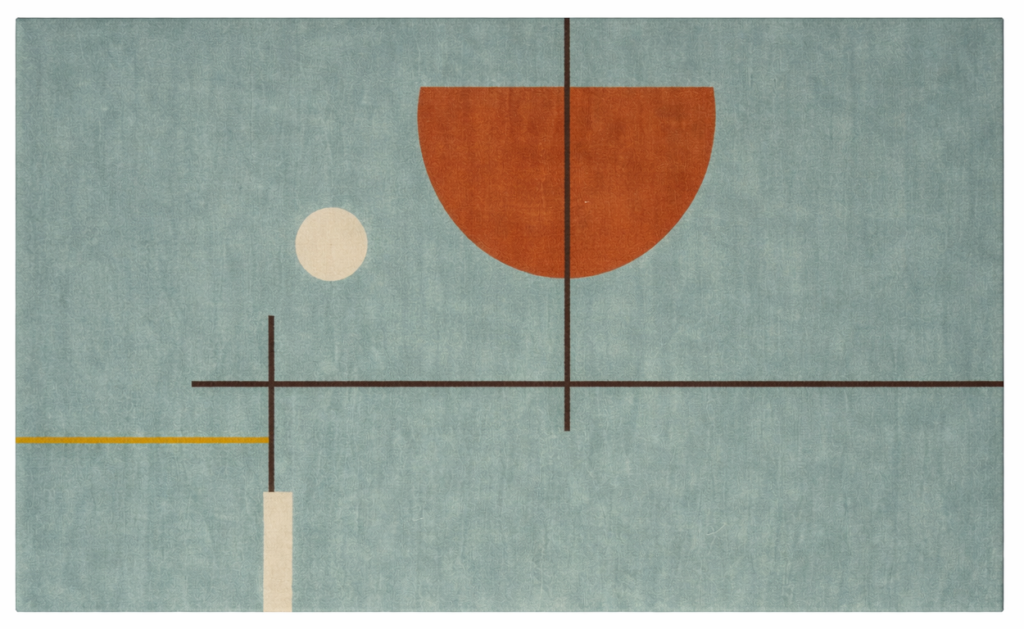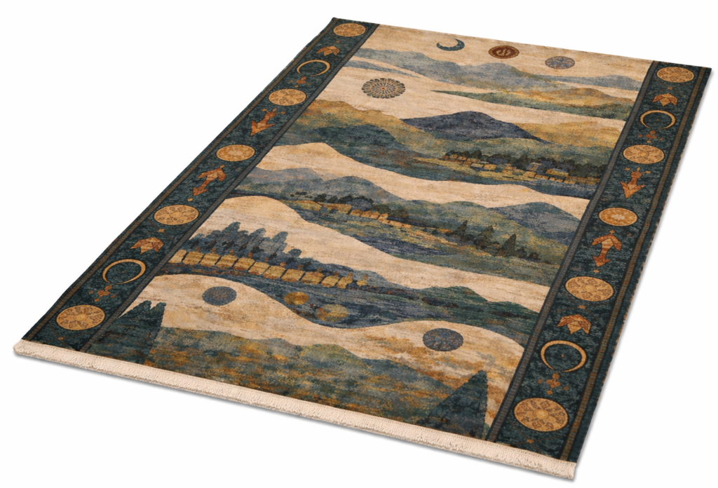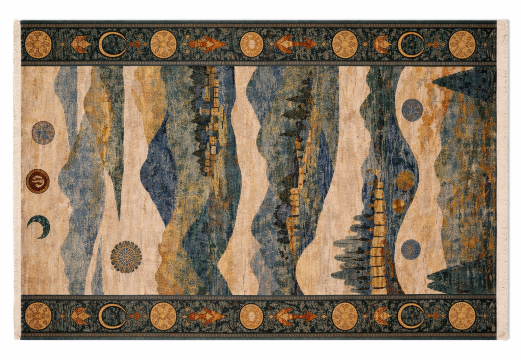 Design: Abstract landscape–inspired hand-knotted design featuring layered mountains, flowing terrain, and symbolic motifs, framed with a decorative tribal border.
